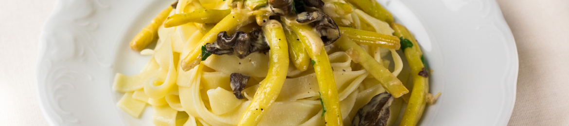 Cebulę pokrój w drobną kostkę i podsmaż na maśle, aż delikatnie się zeszkli. Dodaj grzyby, a następnie podsmaż przez chwilę. Podlej wszystkie składniki białym winem i duś na wolnym ogniu ok. 5 minut. Następnie dodaj fasolkę i duś całość na wolnym ogniu, aż fasolka zmięknie. Dodaj śmietanę, dopraw całość solą oraz pieprzem. Duś przez kolejne 2-3 minuty.